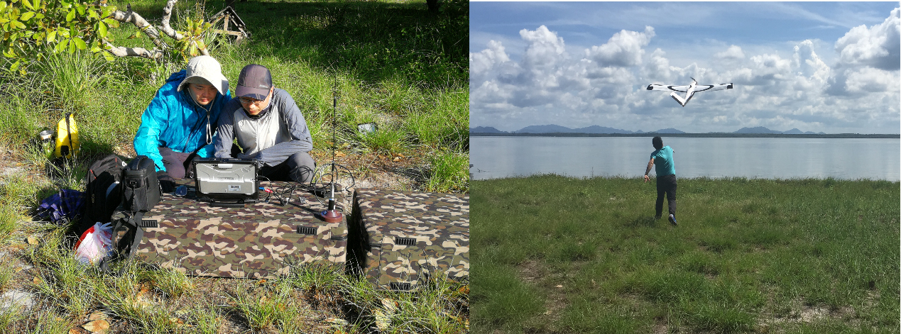 國家海洋技術中心與泰國普吉海洋生物中心在2016年建立了合作關系,本次任務是在中泰聯委會海洋技術合作項目框架下,在2017年中泰無人機監測的基礎上,雙方開展的第二次合作。主要監測目的是應用無人機獲取瀕危海洋生物儒艮的分布情況及海草床、紅樹林等棲息環境的覆蓋范圍,技術人員利用2架固定翼無人機搭載可見光相機、1架旋翼無人機搭載多光譜相機獲取了目標海域的正射影像數據、空中全景數據、多光譜數據等,共飛行固定翼12架次,旋翼4架次,監測面積近60平方公里。
