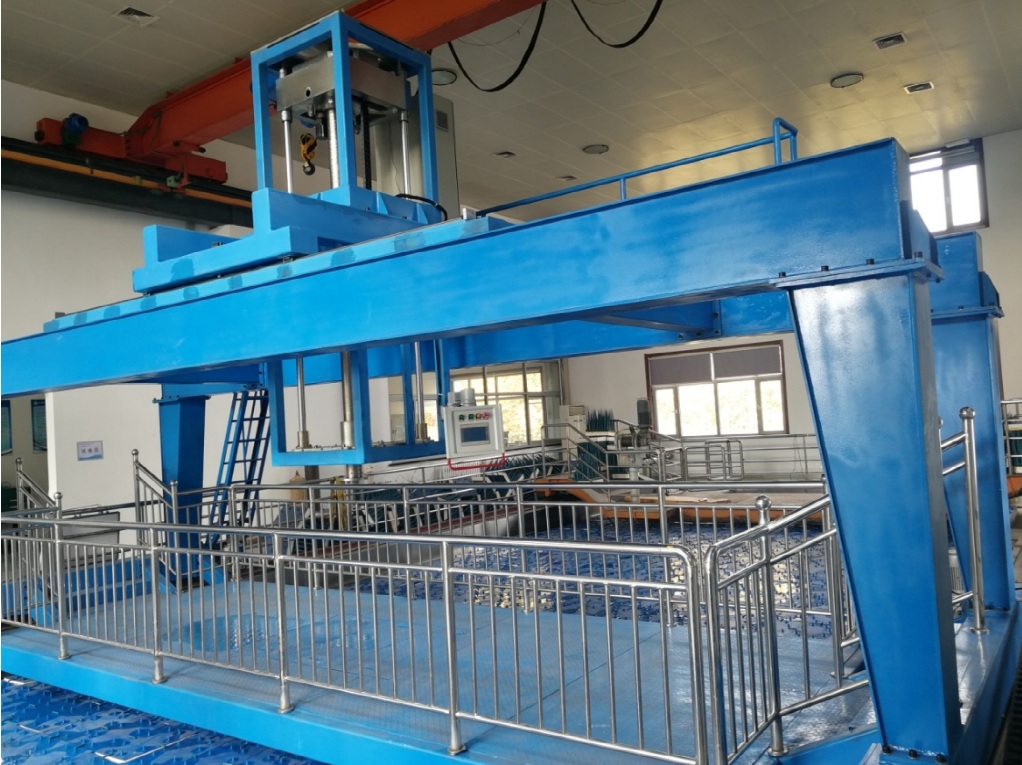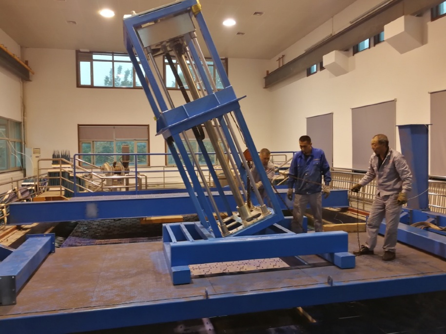 移動實驗平臺按照設計方案制造完成后,實驗室人員于10月13日到制造現場完成基本結構和功能的預驗收。11月3日至5日,開展了移動實驗平臺結構件的進場、安裝等工作。在此過程中,遇到了諸如實驗室空間有限等問題,通過實驗室人員和安裝人員的共同努力,在未破壞實驗室內原有設備的前提下,成功完成了移動實驗平臺的組裝工作。11月6日至7日,開展了移動實驗平臺的調試工作,調試完成后的移動實驗平臺縱向運動范圍15m,深度方向運動范圍不小于2.3m,可接延長桿至6m,小車橫向運動范圍2.3m,回轉角度范圍±360º,回轉控制誤差:不大于±0.1°,水聲測試系統計算機通過RS232通訊接口,采用無線數傳模塊與現場控制器通訊。經調試驗證,移動實驗平臺全部功能均滿足設計方案的指標要求,順利通過驗收。