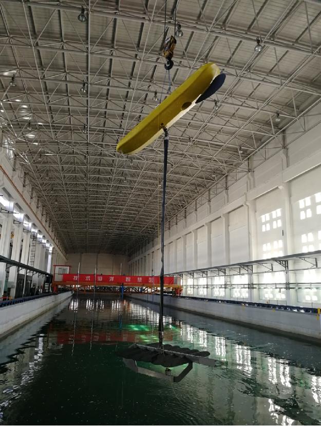 中心深海室波浪能滑翔器課題組在原有863項目海試樣機基礎上,針對水下牽引機的推進性能進行優化設計,完成了新型樣機的組裝調試。日前,在中心動力環境實驗室波浪水池內完成了規則波浪驅動下波浪能滑翔器的平臺航行性能試驗。