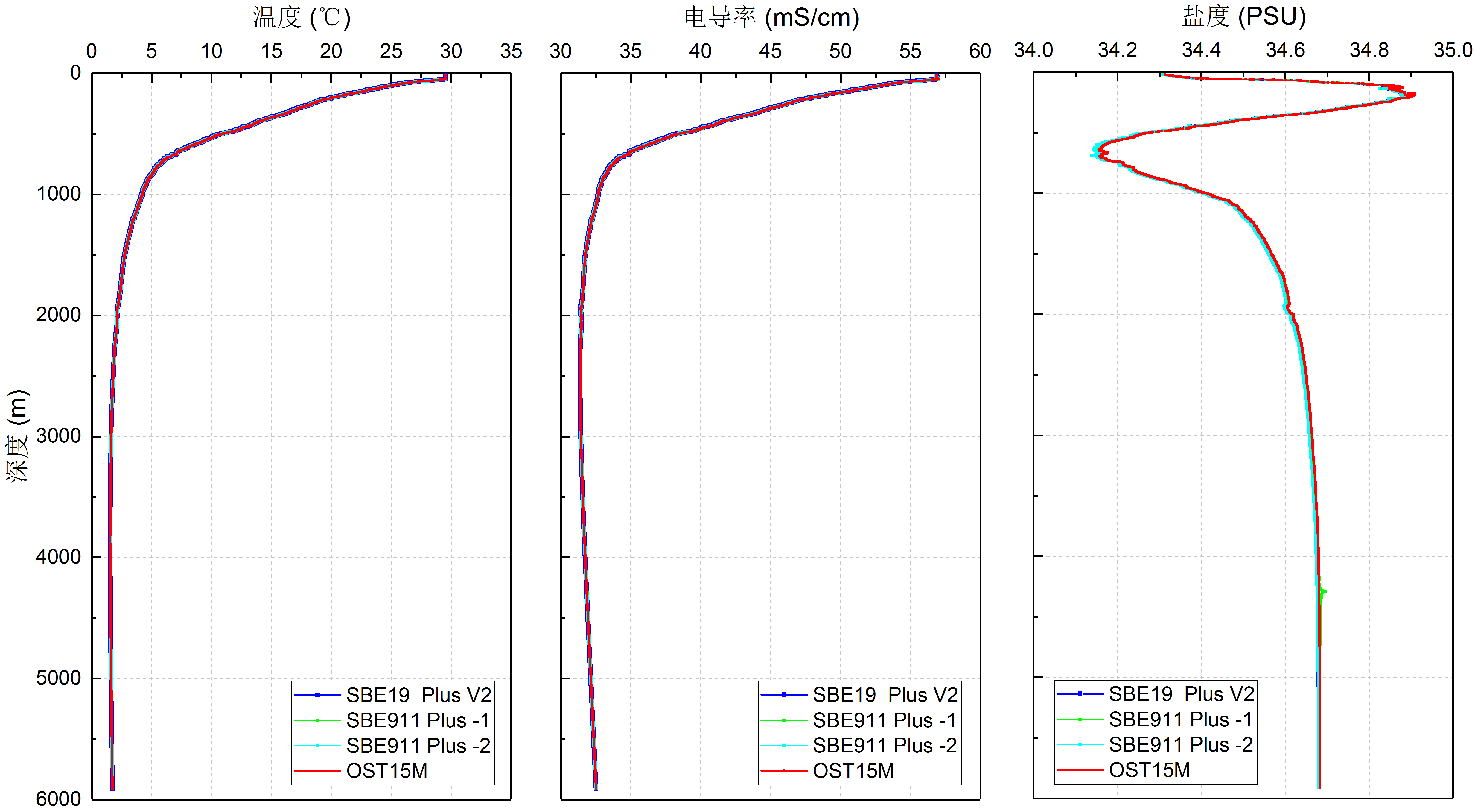 在本航次中,“OST15M型船載高精度自容式溫鹽深測量儀”完成了與美國SBE911 PLUS CTDSBE19 PLUS V2 CTD的多剖面同步比測試驗,并進行了同步定深采水試驗,采水成功率100%。試驗最大下放深度5915米,最大采水深度4800米,獲取了大量西北太平洋深海溫鹽剖面數據以及超過500升的深海水樣。經過與美國SBE911 PLUS CTDSBE19 PLUS V2 CTD數據對比,國產儀器在總有效數據量占比、剖面數據動態跟蹤、數據一致性、相關性等方面均達到國外同類產品的水平。