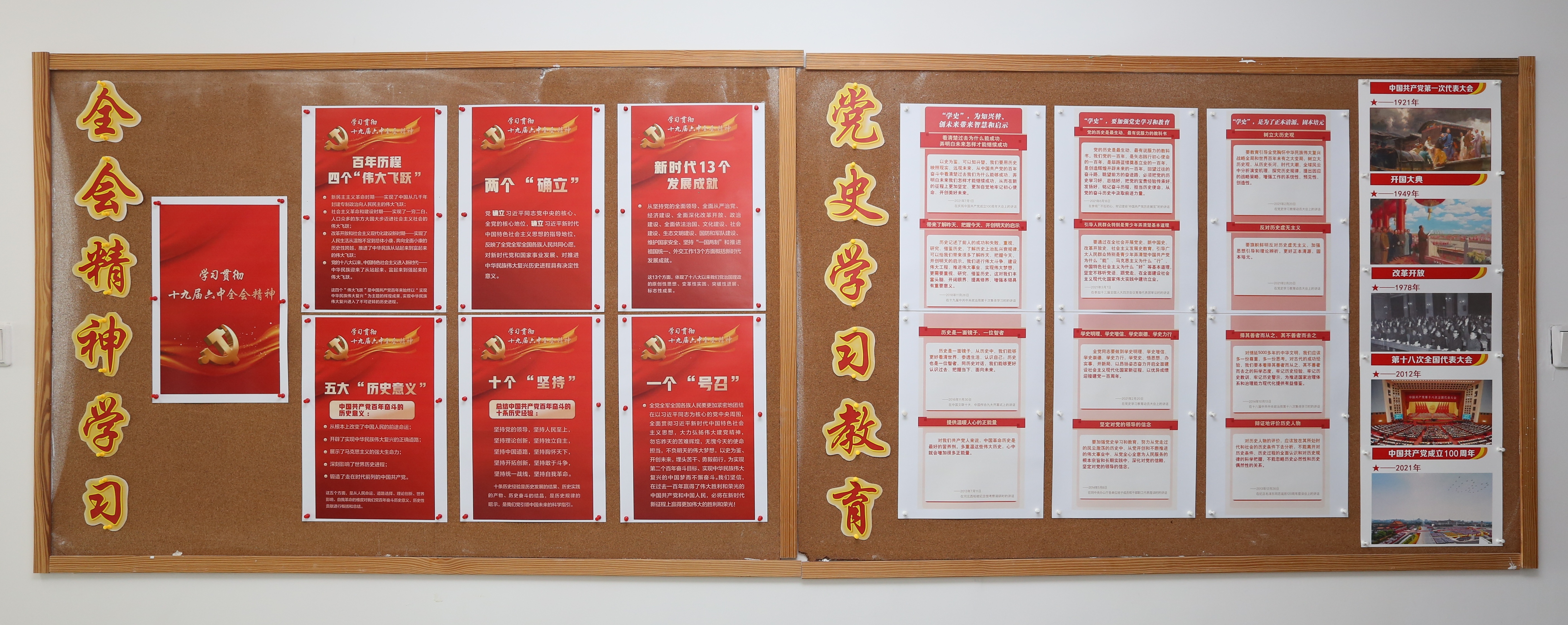 展板集教育性和展示性于一體,設計巧妙、內容豐富,包括“黨史學習教育”、“全會精神學習”、“支部活動”和“學習園地”四個板塊。“黨史學習教育”板塊圖文并茂,展現了建黨百年歷程中的部分重大事件以及關于“學史”重要意義的闡述;“全會精神學習”板塊系統展示了《中共中央關于黨的百年奮斗重大成就和歷史經驗的決議》的學習要點,宣傳黨的十九屆六中全會精神;“支部活動”板塊集中展示了支部成立以來組織開展的集中學習、專題交流、黨課以及主題黨日活動等;“學習園地”展示了支部部分學習材料以及全體黨員的黨史學習心得,反映黨員學習效果。