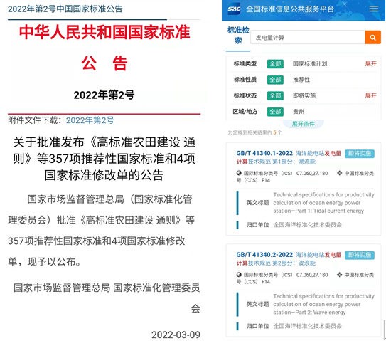 業(yè)務(wù)工作近日,我中心承擔(dān)的《海洋能電站發(fā)電量計算技術(shù)規(guī)范 第1部分:潮流能》(GB/T 41340.1-2022)和《海洋能電站發(fā)電量計算技術(shù)規(guī)范 第2部分:波浪能》(GB/T 41340.2-2022),經(jīng)國家市場監(jiān)督管理總局、國家標(biāo)準(zhǔn)化管理委員會批準(zhǔn),于2022年3月9日正式發(fā)實(shí)施。《規(guī)范》確立了海洋能電站發(fā)電量計算的流程、微觀選址和發(fā)電量計算方法,規(guī)定了潮流能和波浪能電站發(fā)電量計算的工作流程、陣列規(guī)模的等級劃分、資料收集、現(xiàn)場觀測、數(shù)值模擬、微觀選址、發(fā)電量計算方法和技術(shù)報告的編寫內(nèi)容,是指導(dǎo)我國海洋能電站發(fā)電量計算的基礎(chǔ)性標(biāo)準(zhǔn)。《規(guī)范》的正式實(shí)施將為潮流能和波浪能電站發(fā)電量計算提供支撐和依據(jù),研制海洋能電站發(fā)電量計算技術(shù)規(guī)范,規(guī)范海洋能發(fā)電站計算方法,是大規(guī)模開發(fā)利用海洋能資源的重要技術(shù)保障。(海洋能發(fā)展中心 吳國偉)