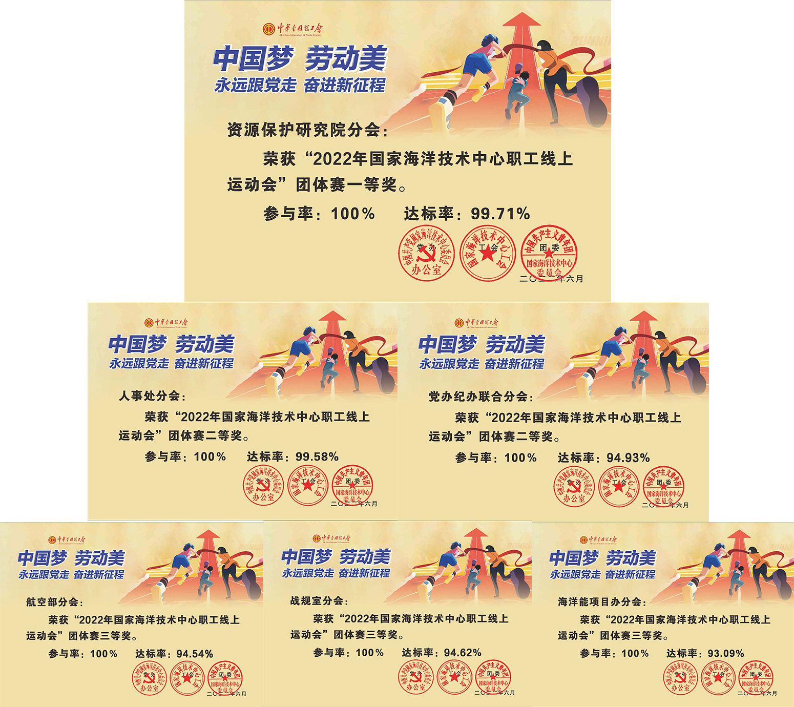 據統計,資源保護研究院分會以29人100%達標和99.71%的部門達標率獲團體一等獎,人事處分會、黨辦紀辦聯合分會獲團體二等獎,戰規室分會、航空部分會、海洋能項目辦分會獲團體三等獎。中心運動團以10150.84分獲天津賽區第六名。(黨辦 侯權宇)
