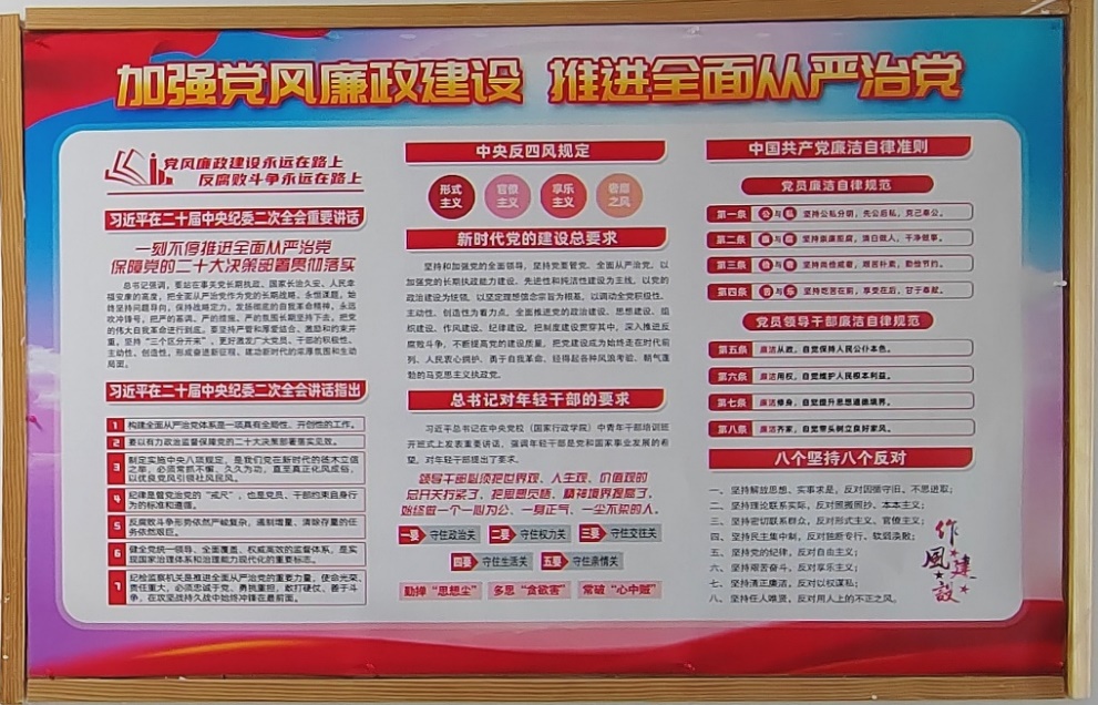 習近平總書記在二十屆中央紀委二次全會上發表重要講話強調,一刻不停推進全面從嚴治黨、保障黨的二十大決策部署貫徹落實。展板設置了“加強黨風廉政建設 推進全面從嚴治黨”主題板塊,宣傳習近平總書記在二十屆中央紀委二次全會上的重要講話精神、中央反四風規定、習近平總書記對年輕干部的要求等內容。